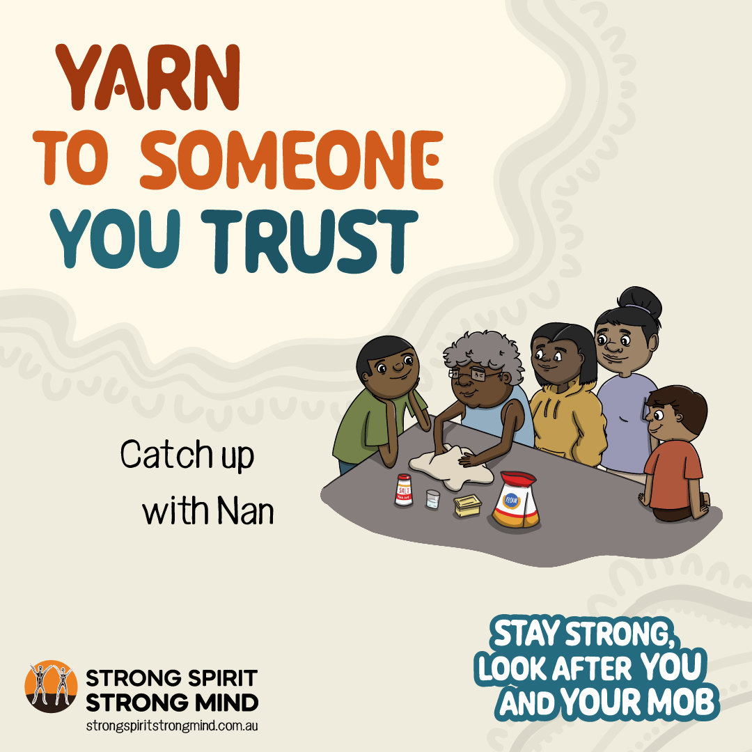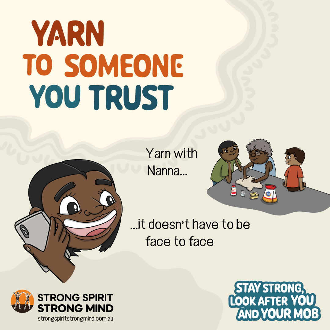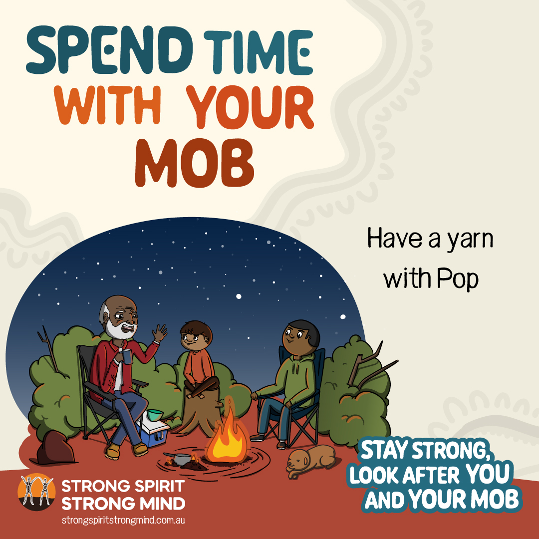 Spending time with your mob helps keep you feeling strong! Yarn with Pop, it can be face to face or even a phone call.